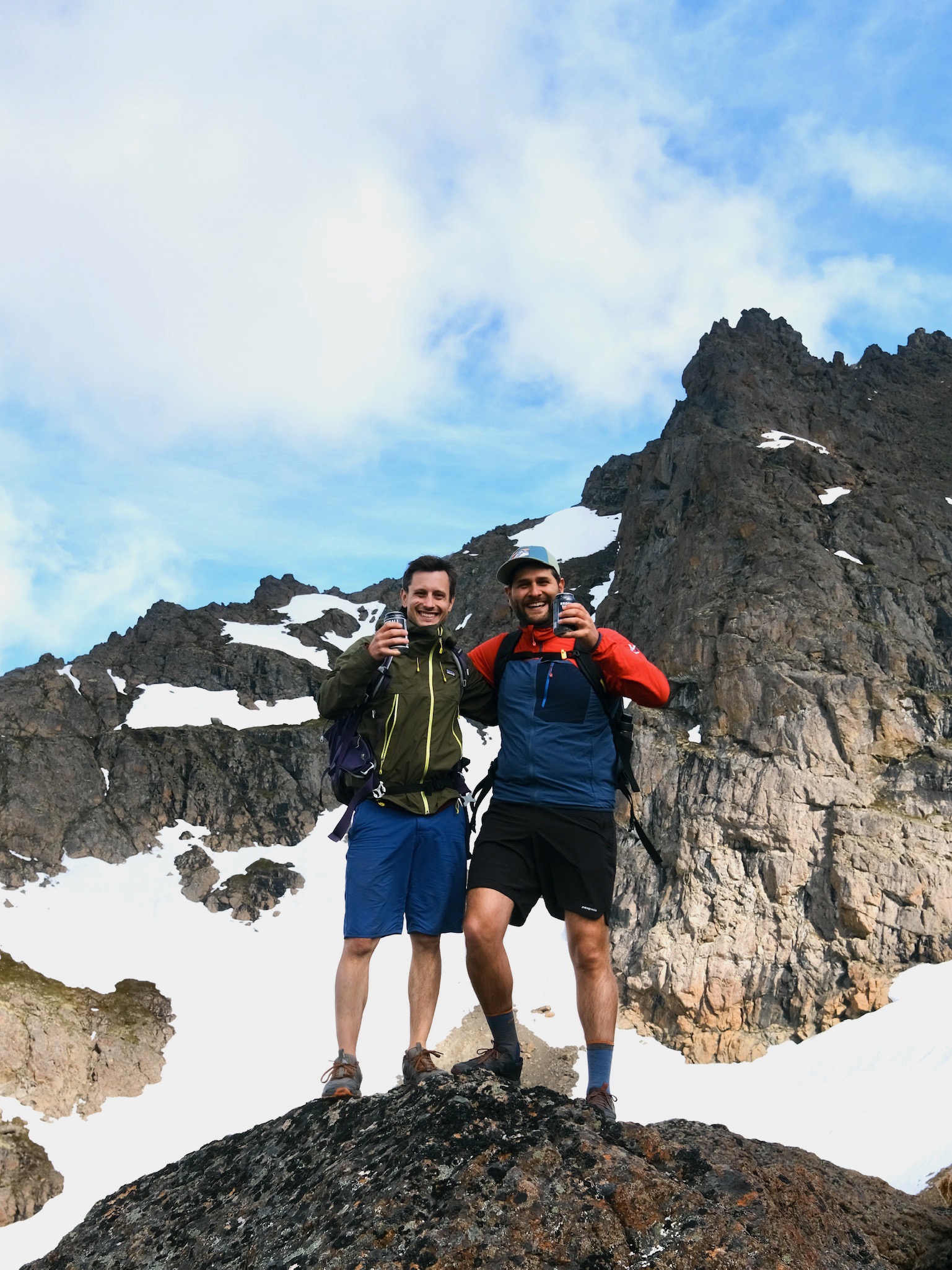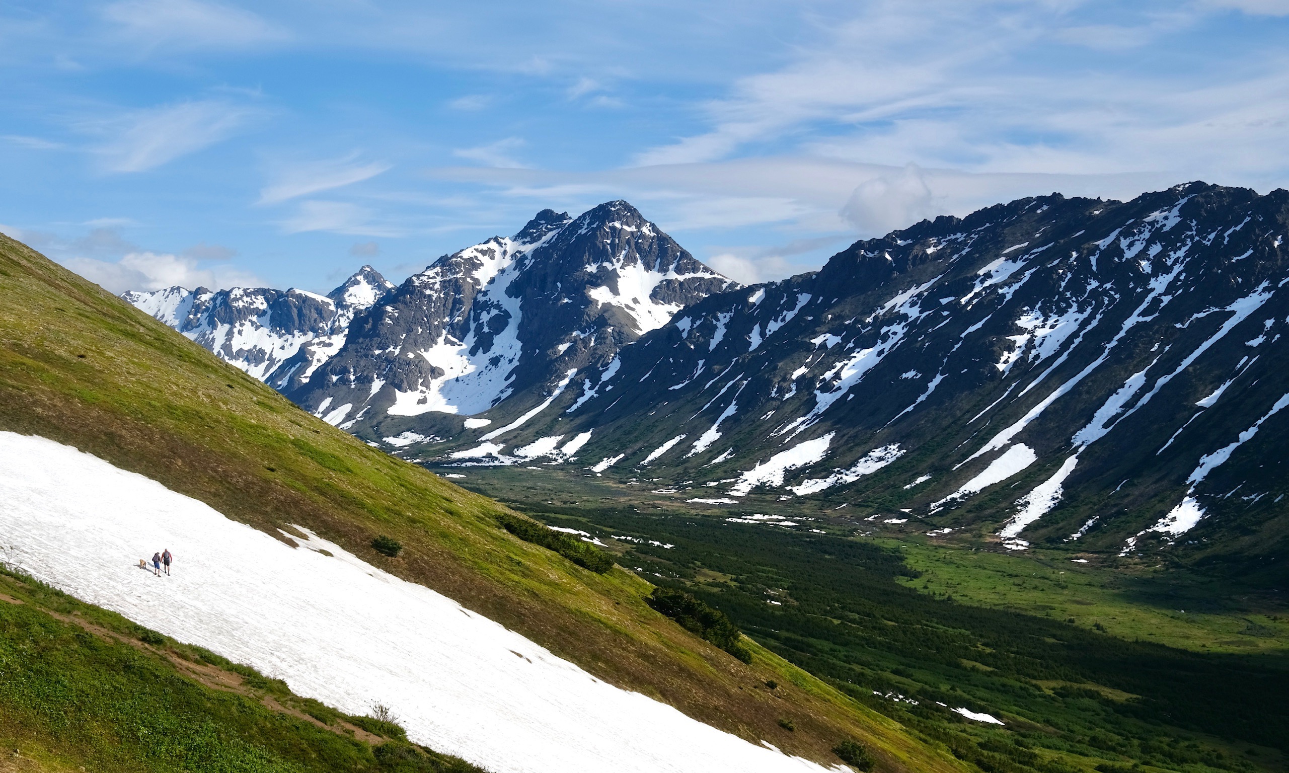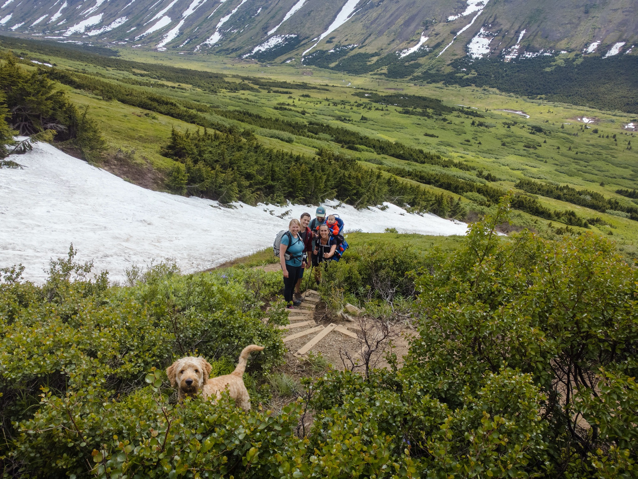 Our very first hike (equipped with bear and bug spray. Standard equipment here) takes us high into the Chugach Mountains. Start and end time would not matter much. It doesn’t get really dark in summer, because the sun doesn’t set until after 11pm. Luckily we have Jemma with us. The young lady makes sure that we are back at least halfway on time for her (and sometimes my) bedtime between 7 and 8 pm. Guido also gets to know glissading here. A method to get down the mountain faster. On the butt.
