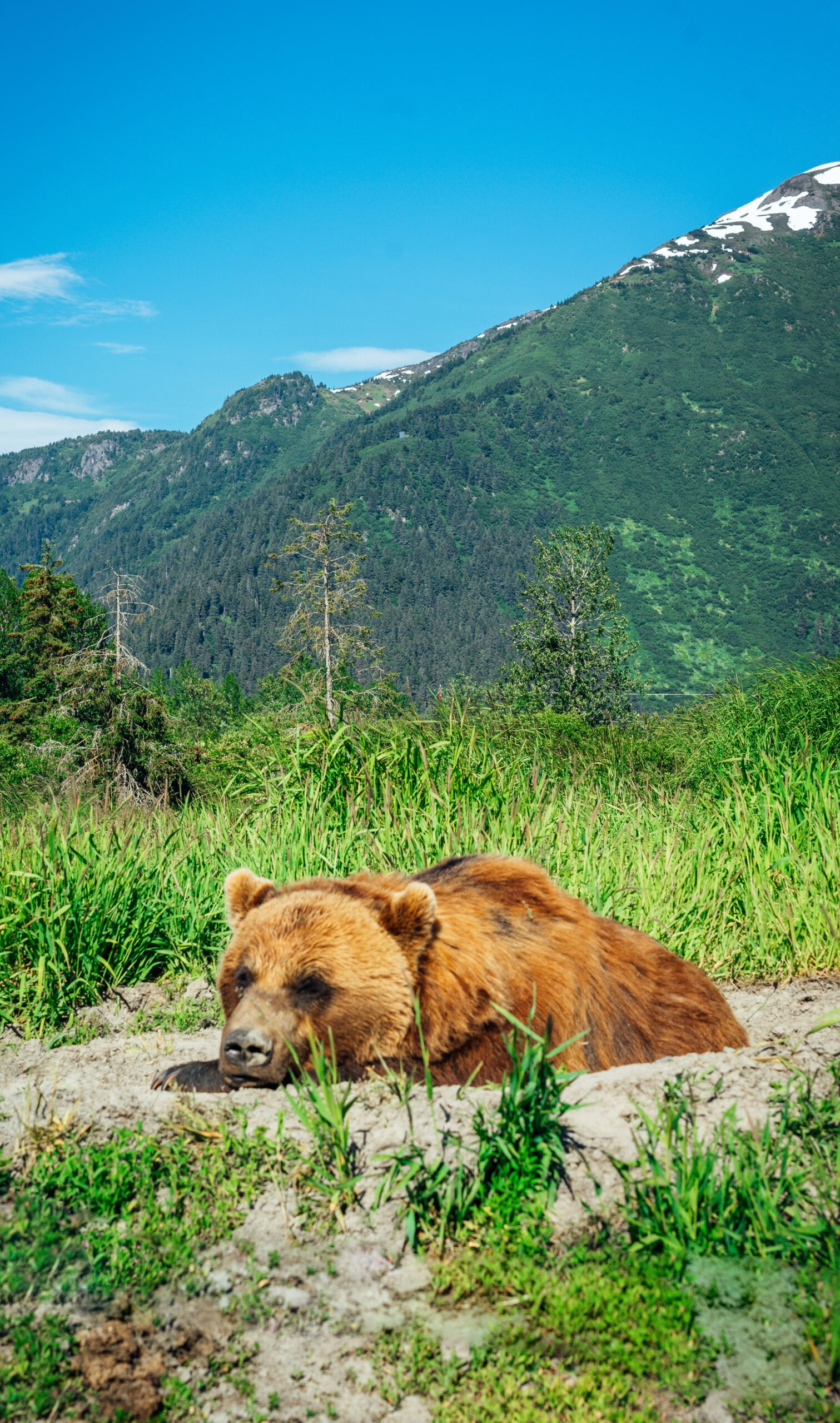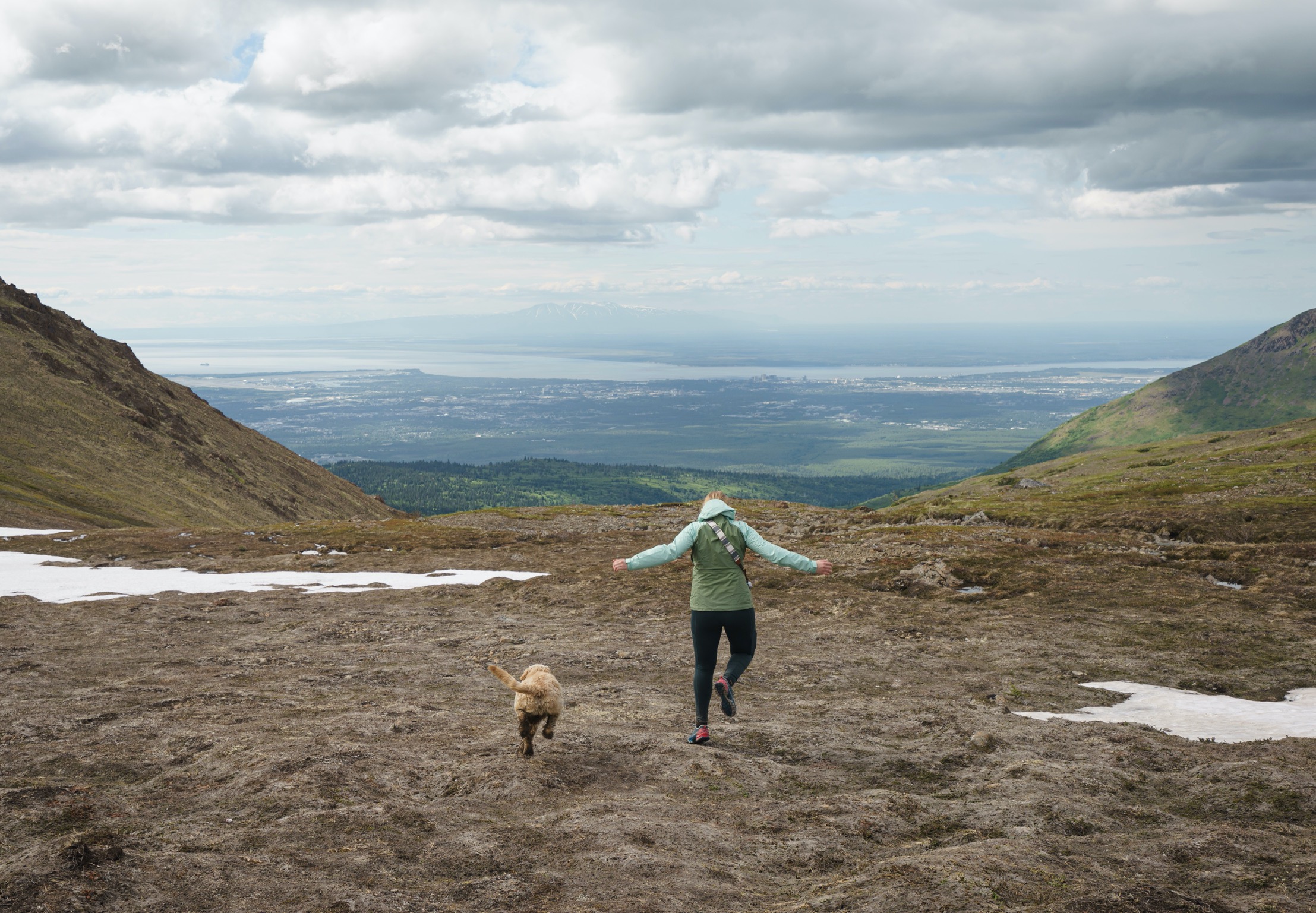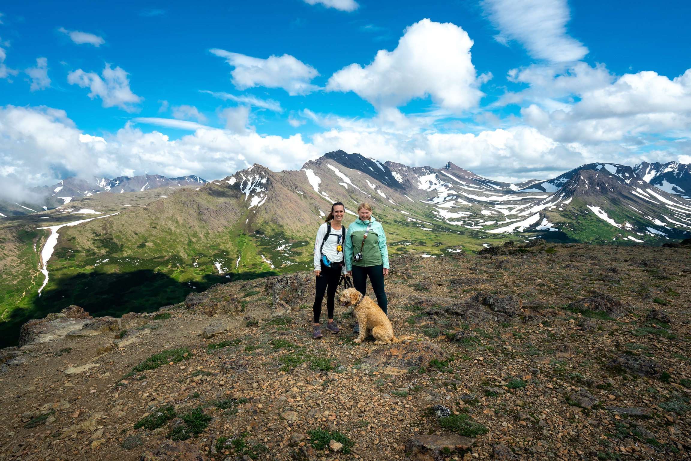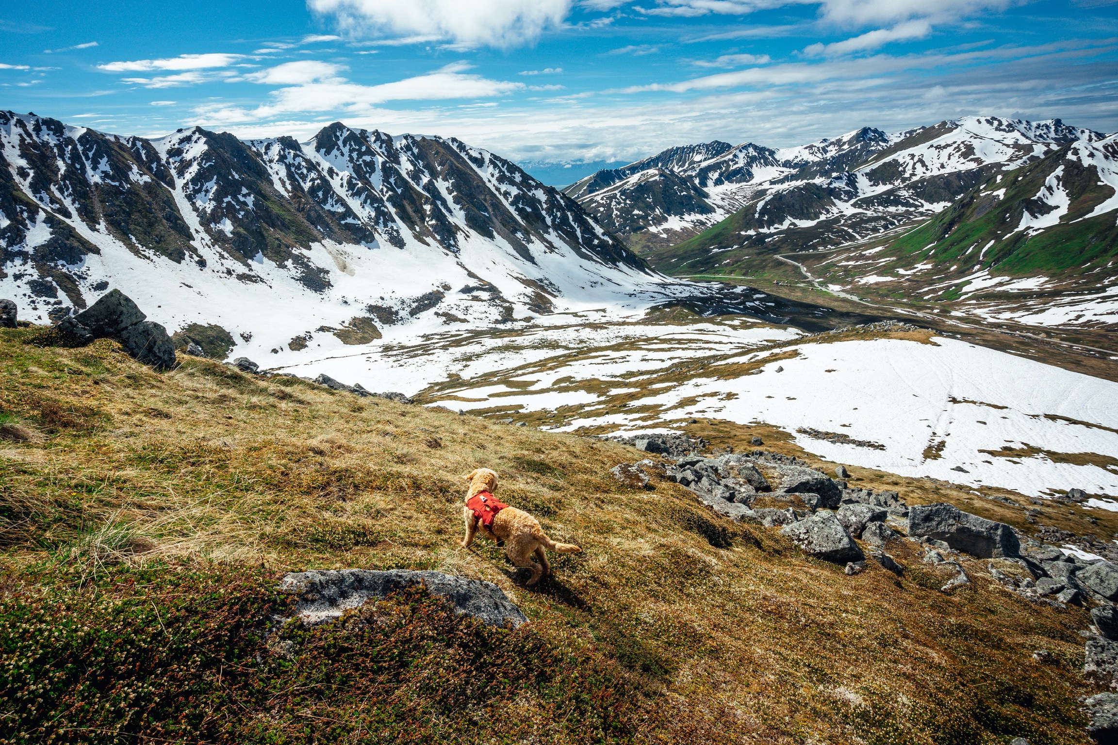 Our very first hike (equipped with bear and bug spray. Standard equipment here) takes us high into the Chugach Mountains. Start and end time would not matter much. It doesn’t get really dark in summer, because the sun doesn’t set until after 11pm. Luckily we have Jemma with us. The young lady makes sure that we are back at least halfway on time for her (and sometimes my) bedtime between 7 and 8 pm. Guido also gets to know glissading here. A method to get down the mountain faster. On the butt.