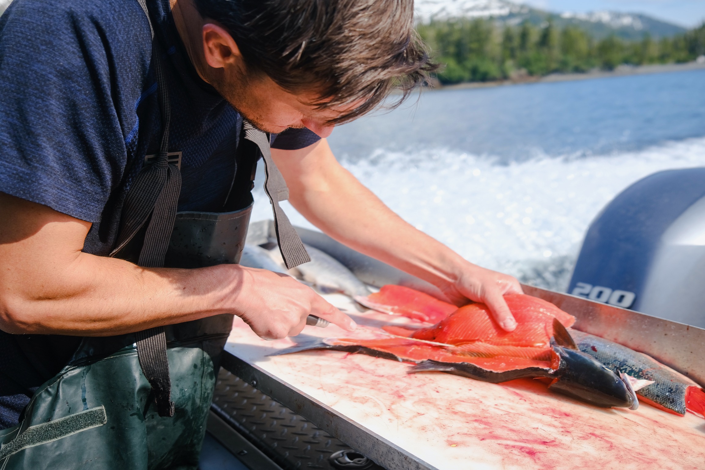 Um das hier abzukürzen (ich weiß, zu spät). Guido war sehr erfolgreich, ich mittel, aber am Ende haben wir unsere Lizenz beide ausgeschöpft. Auf dem Weg zurück zeigt Justin Guido wie der Fisch filetiert wird. Bei strahlend blauen Himmel, mit Bergen und Gletschern im Hintergrund.