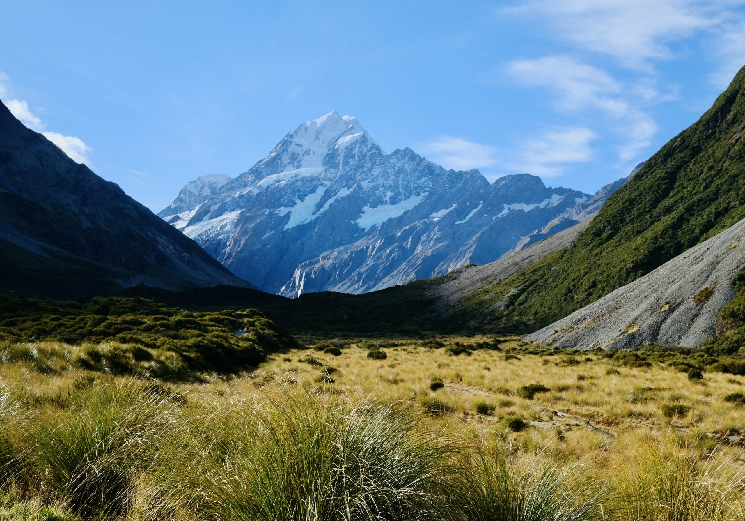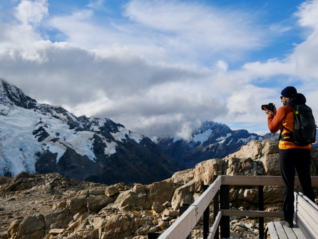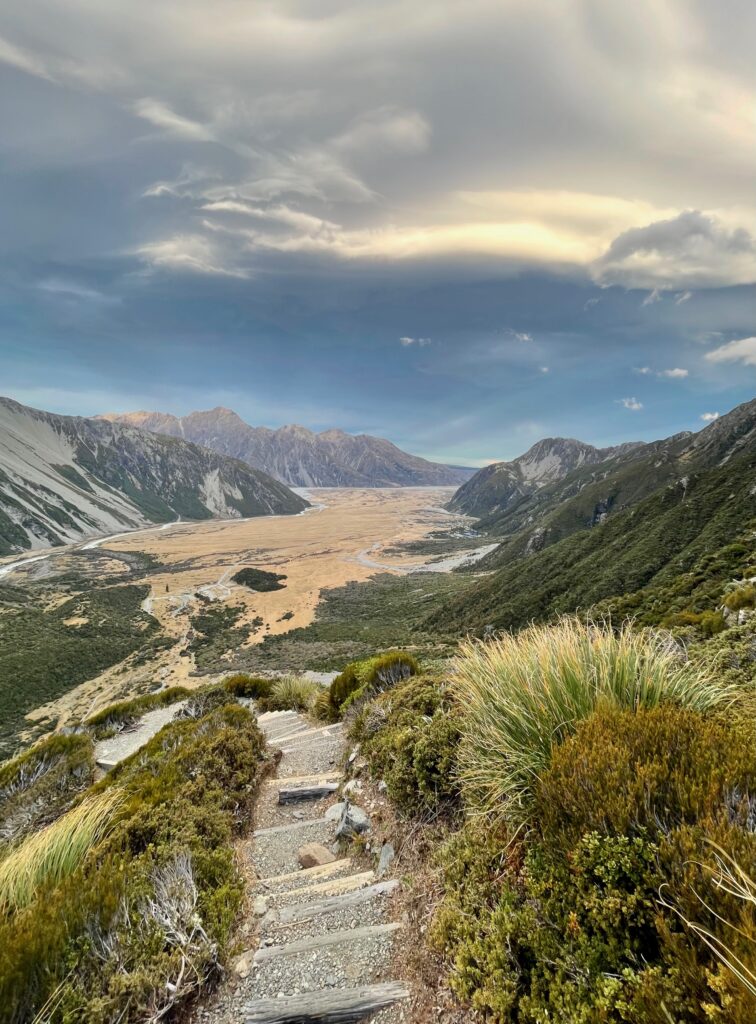 Getting Guido out of bed for a sunrise is the biggest challenge. Not the upcoming hike with an ascent of 1000 m. He has no problem with that. I do. The first part has the wonderful name “Stairway to heaven”, about 2200 steps and 600 m of ascent. It doesn’t help that I am overtaken by a young lady who tells me that she is a beginner and doesn’t actually hike at all. But these 2200 steps are not the strenuous part at all. Then the climbing begins. We pass glaciers from which avalanches come down. For those who want to experience this too: Mueller Hut Track is the name of the hike. We arrive at the car with the last rays of sunshine and just before the floodgates open. On the way, Guido also becomes the private photographer of two female hikers. The advantage is that we also get a picture together.