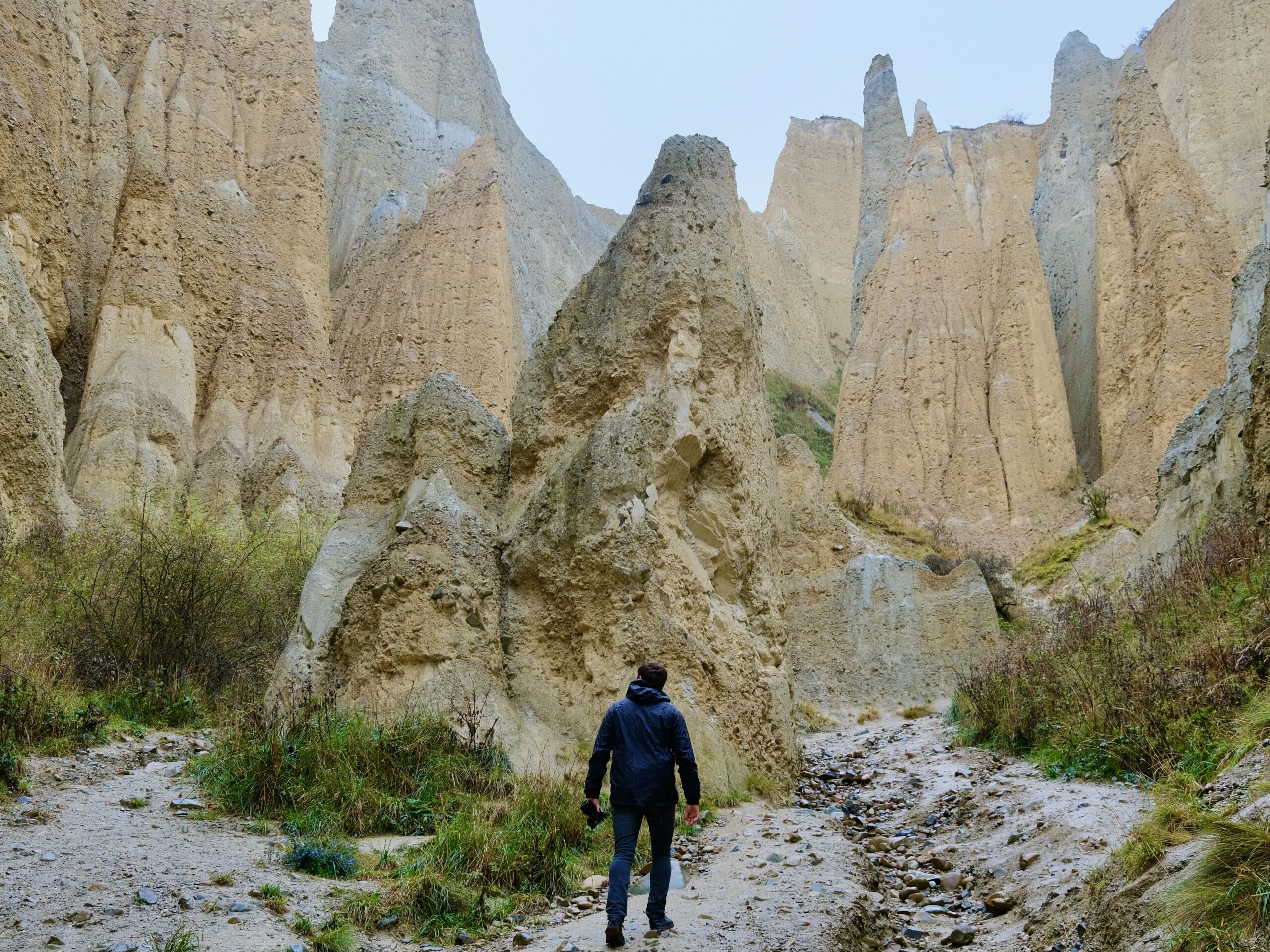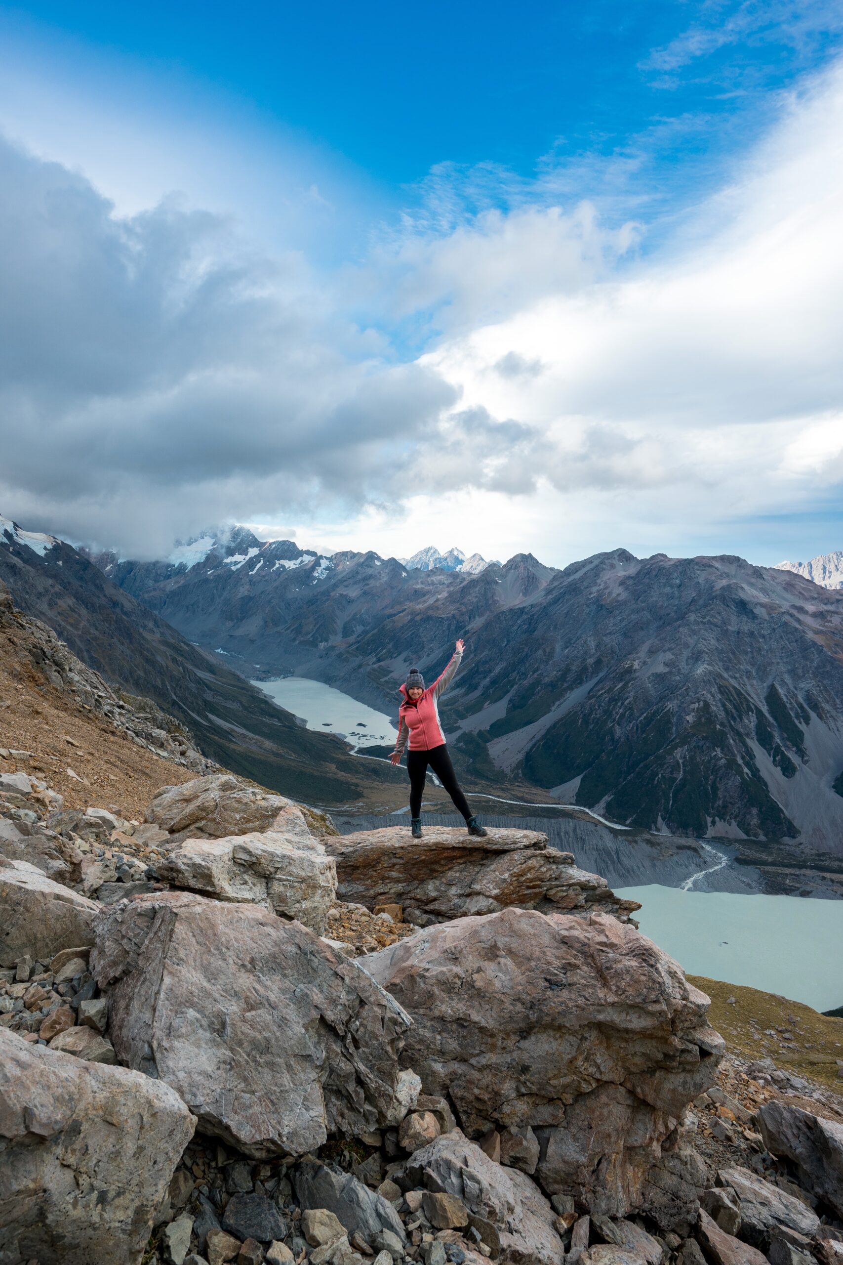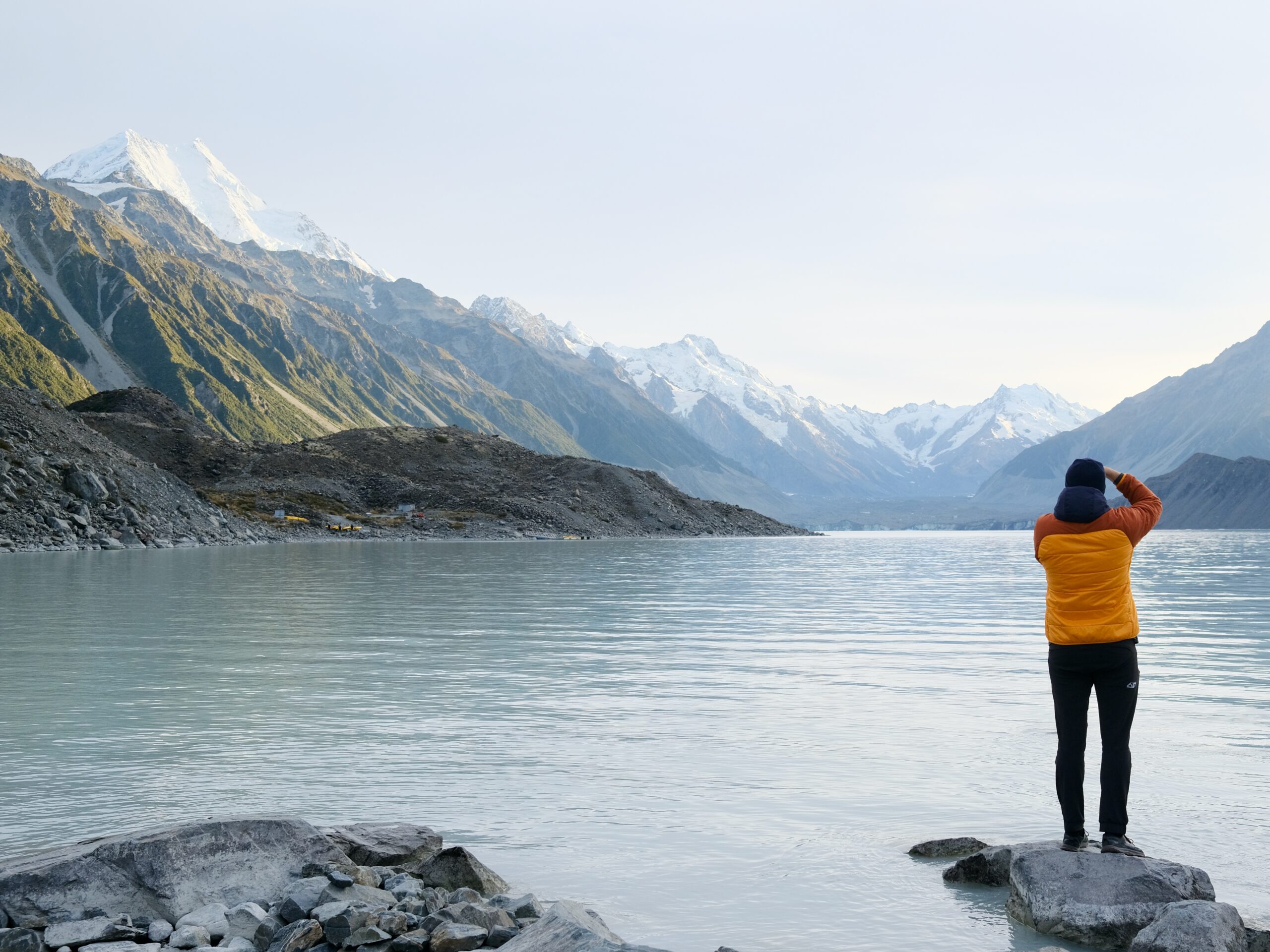 Getting Guido out of bed for a sunrise is the biggest challenge. Not the upcoming hike with an ascent of 1000 m. He has no problem with that. I do. The first part has the wonderful name “Stairway to heaven”, about 2200 steps and 600 m of ascent. It doesn’t help that I am overtaken by a young lady who tells me that she is a beginner and doesn’t actually hike at all. But these 2200 steps are not the strenuous part at all. Then the climbing begins. We pass glaciers from which avalanches come down. For those who want to experience this too: Mueller Hut Track is the name of the hike. We arrive at the car with the last rays of sunshine and just before the floodgates open. On the way, Guido also becomes the private photographer of two female hikers. The advantage is that we also get a picture together.