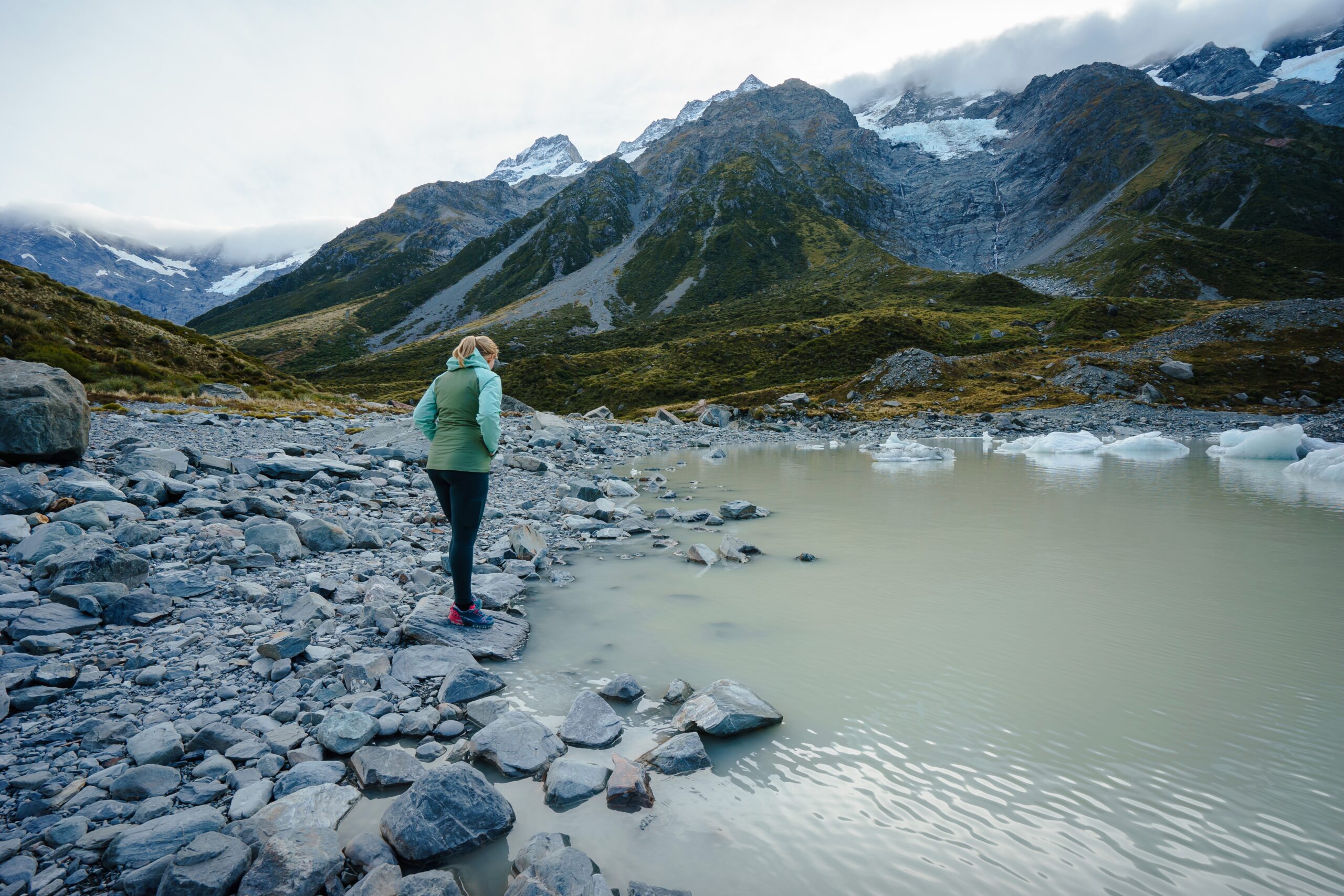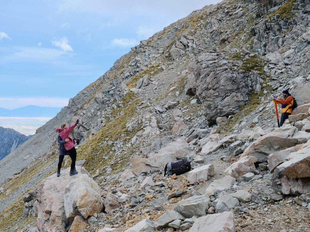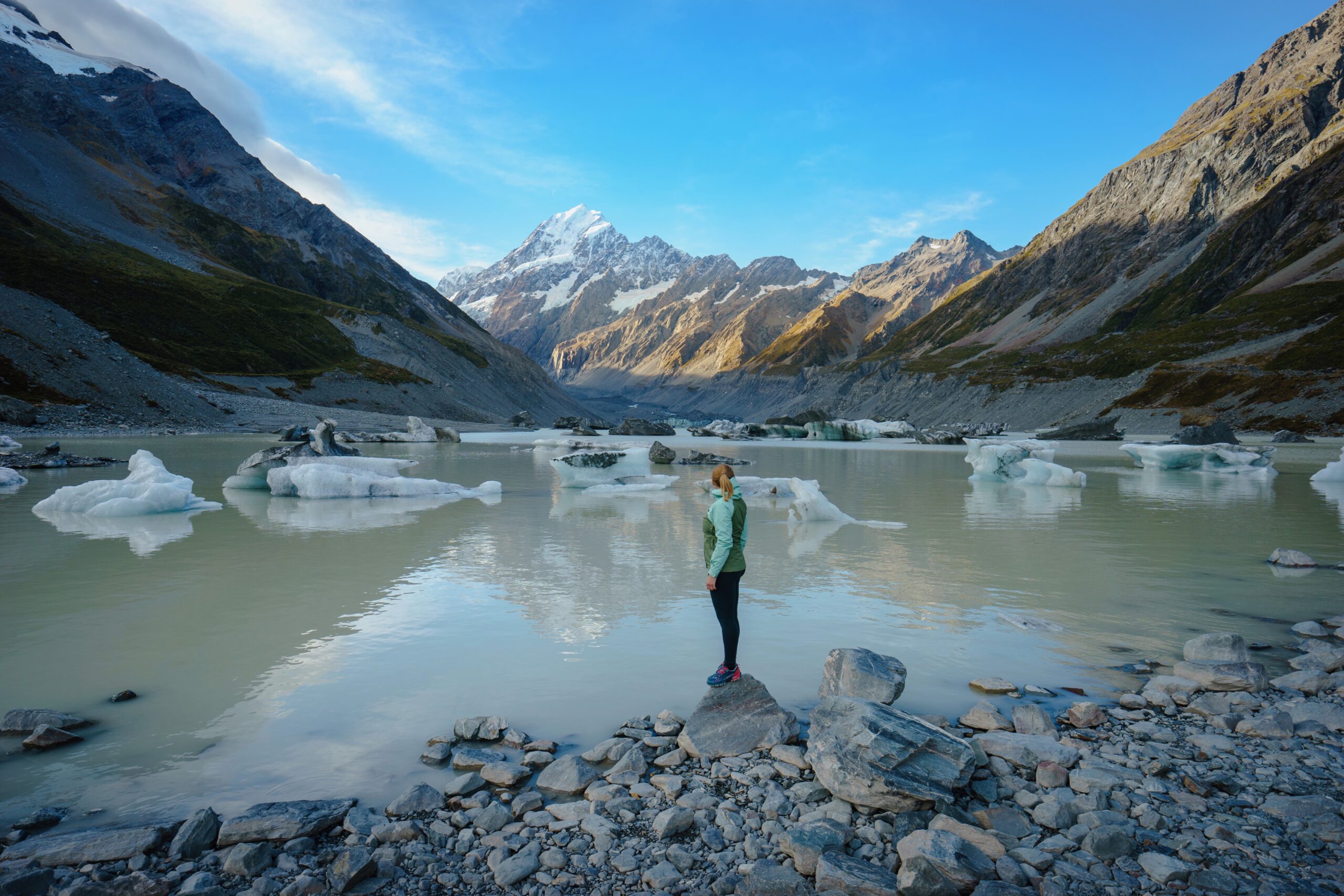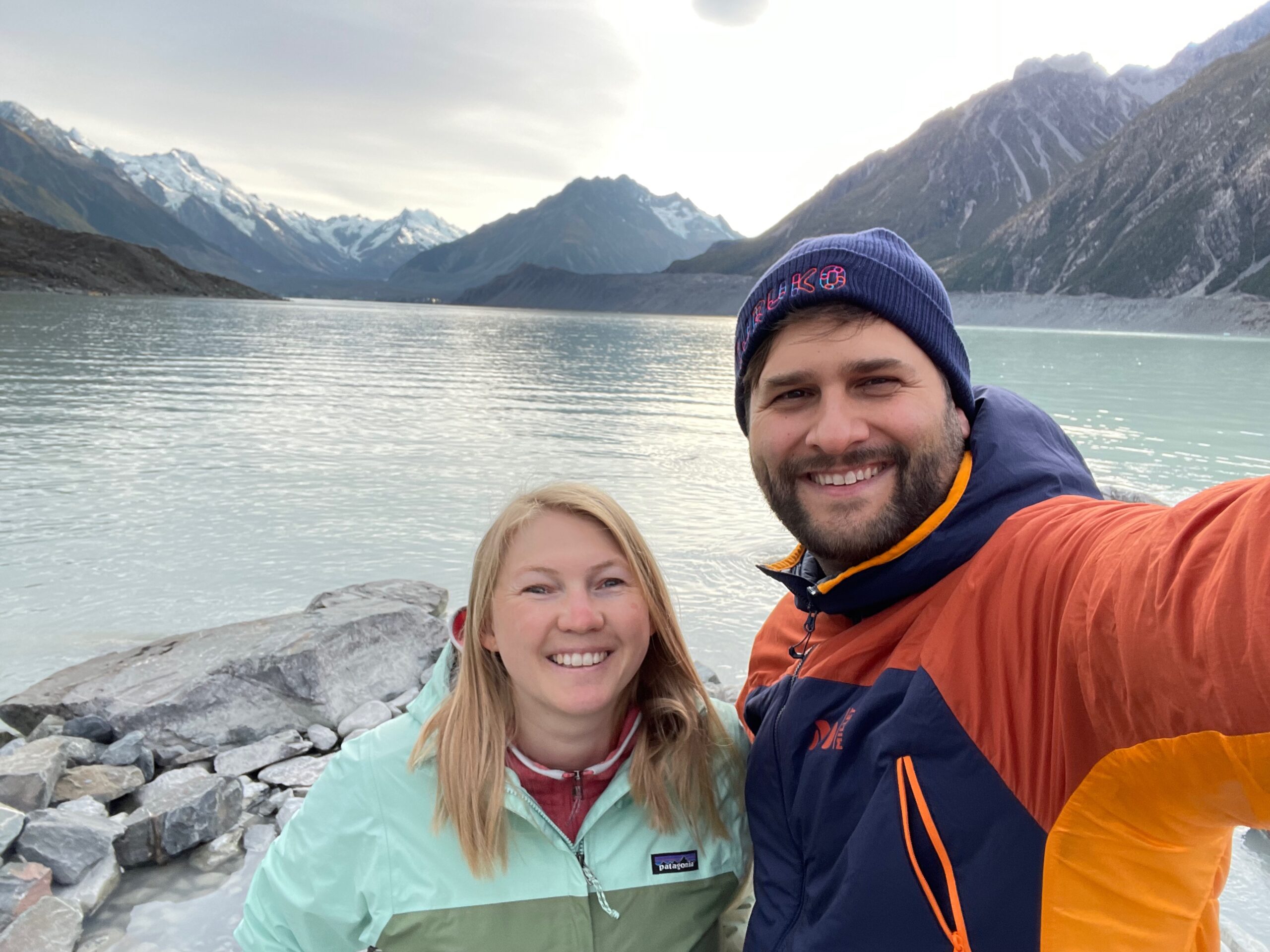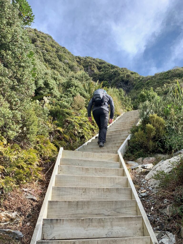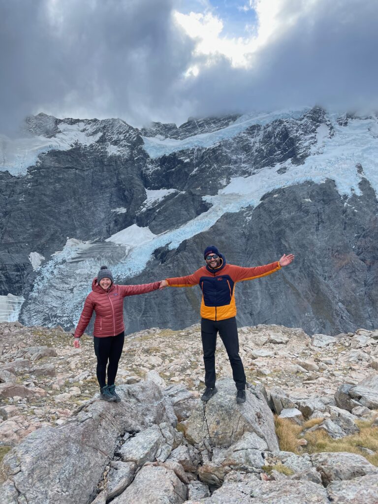 Guido für einen Sonnenaufgang aus dem Bett zu kriegen ist die größte Herausforderung. Nicht etwa die bevorstehende Wanderung mit einem Aufstieg von 1000 m. Damit hat er kein Problem. Ich schon. Der erste Teil hat den wunderschönen Namen “Stairway to heaven”, ca. 2200 Stufen und 600 m Aufstieg. Es hilft nicht, dass ich von einer jungen Dame überholt werde, die mir erzählt, dass sie ja Anfängerin ist und eigentlich gar nicht wandert. Aber diese 2200 Stufen sind gar nicht der anstrengende Teil. Danach geht die Kletterpartie los. Vorbei geht es an Gletschern, von denen Lawinen runtergehen. Für alle, die das auch erleben wollen: Mueller Hut Track heißt die Wanderung. Mit den letzten Sonnenstrahlen kommen wir am Auto an und gerade noch bevor sich die Schleusen öffnen. Unterwegs wird Guido auch noch der Privatfotograf zweier Wanderinnen. Hat den Vorteil, dass auch wir ein Bild zusammen bekommen.