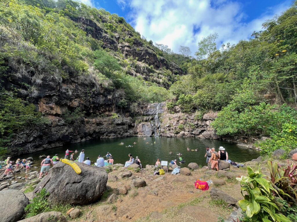 Apparently, and we also got confirmation of this from another Uber driver, they are trying to recoup the financial losses through hard tourist rip-offs. Parking at the famous Waimea Beach, where there are waves up to 30 metres high in winter, costs $20. To our misfortune, I have to admit that we also fell for something like that. $25 per person for the entrance to Waimea Valley with the prospect of swimming at Waimea Waterfall. After a 30-minute walk, we are disappointed: the waterfall is almost dry and full of other people. So we boot straight back.